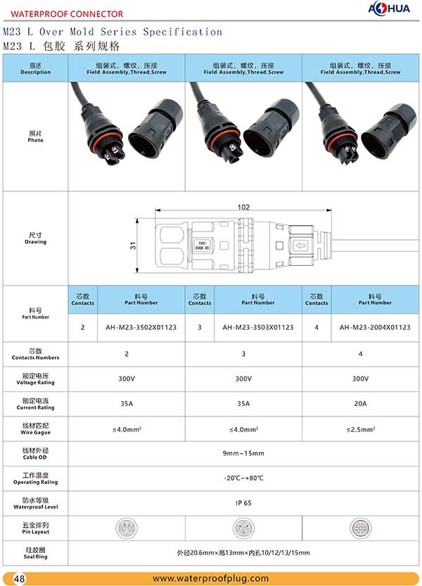 AHUA澳華廠家防水連接器M23直通包膠工業(yè)防水插頭LED接頭