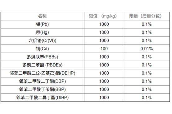 產(chǎn)品均質(zhì)材料中的以下物質(zhì)含量不得超過表格中的限值: