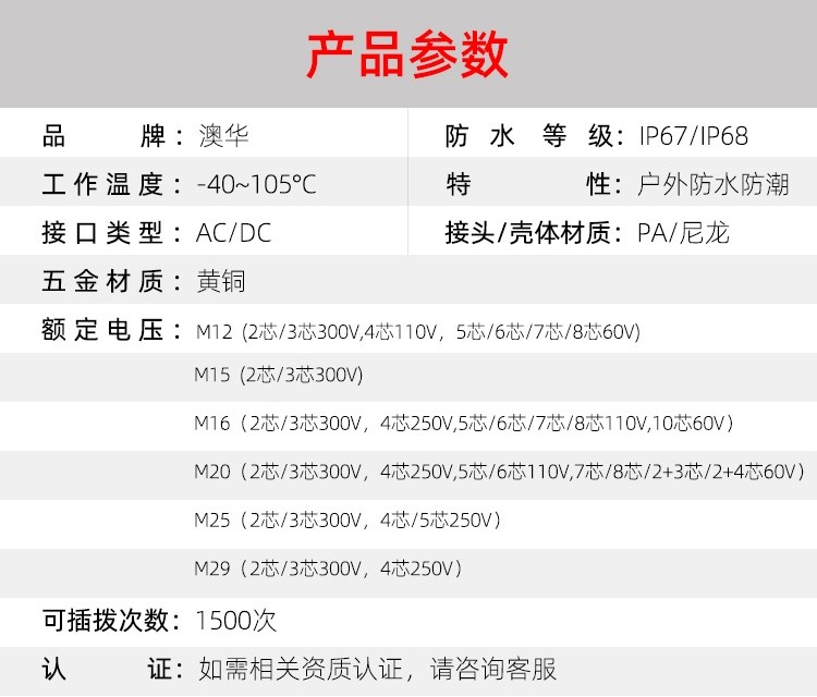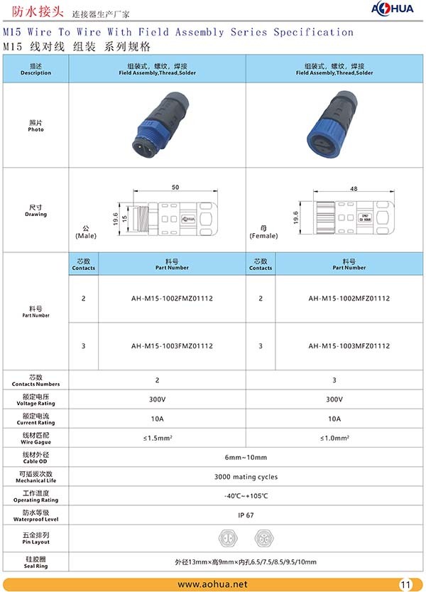 AHUA澳華尼龍M15防水插頭戶外IP67防水連接器CSA公母防水接頭