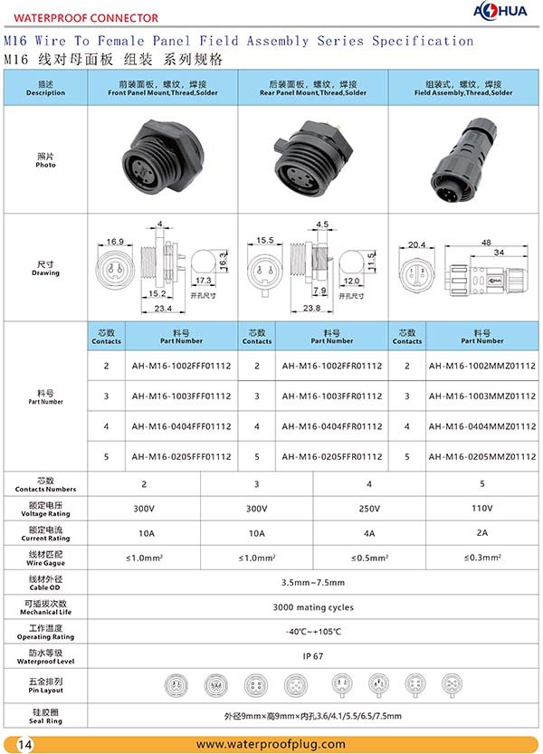 AHUA澳華防水連接器M16前置母面板公母防水接頭航空插頭